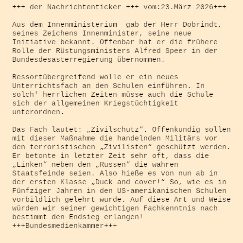 Auch dem desinformiertesten kriegsunwilligen Bundesbürger müsste einleuchten, dass die unermüdlichen Bemühungen des Sozi-Kriegsministers nicht für die Katz' sind. Die Poesie und Kunst im Alltag praktischer Kriegstüchtigkeit eröffnet völlig neue künstlerische Räume, ja Schutzräume einer besonderen Lebenssituation, die es in einem gewöhnlichen Sozialstaat mit guter Bildung nie geben würde. Es sei nur kurz an Ernst Jüngers Der Kampf als inneres Erlebnis erinnert. Deshalb sollte man die derzeitige Bundesregierung nicht verurteilen, versucht sie doch gerade der jungen Generation eine neue Zukunft aufzuzeigen eigenständig „innere Erlebnisse“ zu empfinden.Wie aus gut informierten Kreisen der Meinesforschungsinstitute zu erfahren war, scheint sich bei den jungen Erwachsenen ein Trend zum Militärdienst gelegentlich zu verstärken. Der Verteidigunsminister soll ausdrücklich das sich verbreitende Lebensmotto: "Weniger Bildung, bei mehr Ausbildung in der Angriffsverteidigung - erhobene Faust gegen fruchtlose akademische Gesellschaftstheorien", als Zeichen patriotischer Hoffnung gelobt haben. |